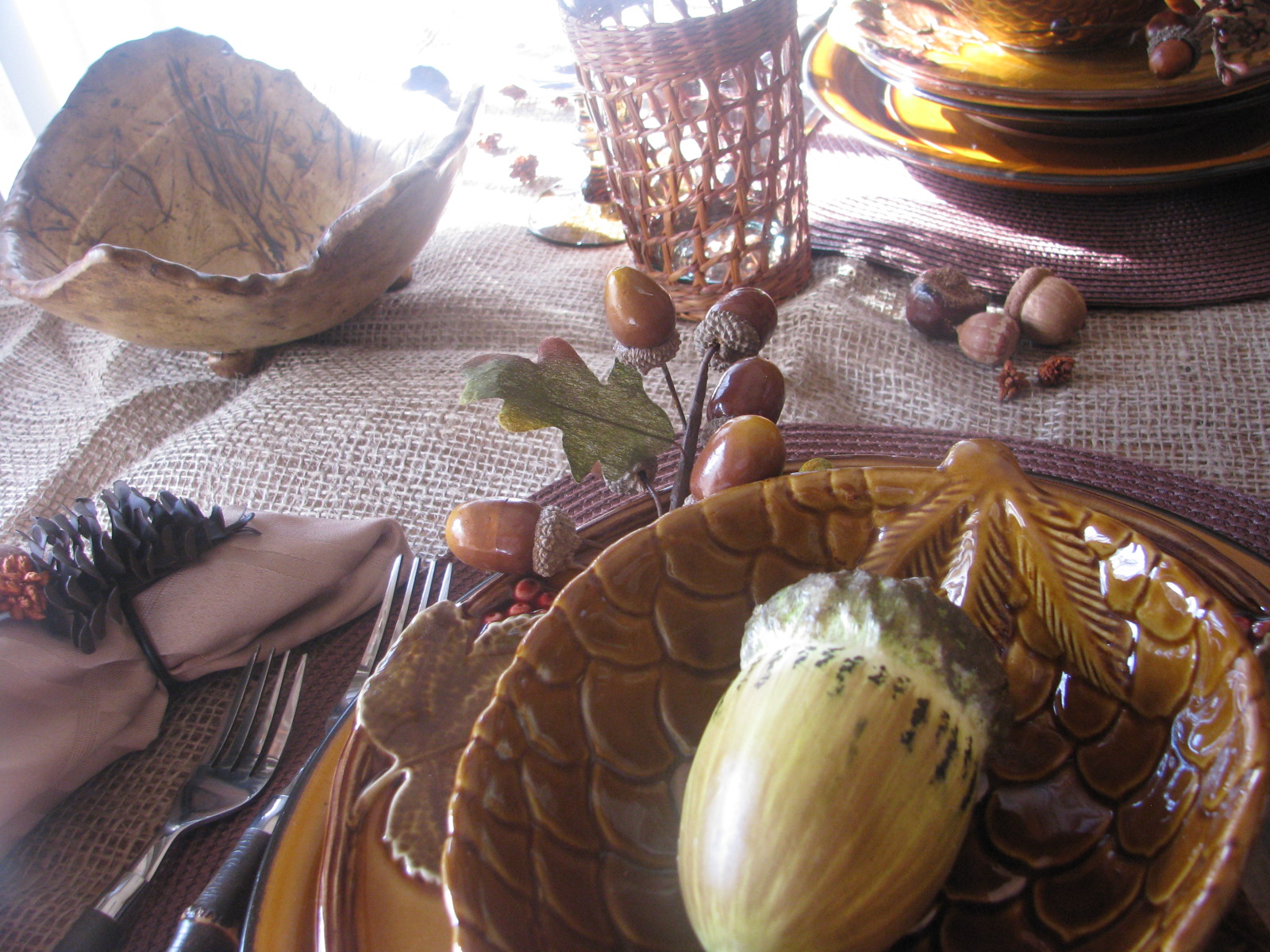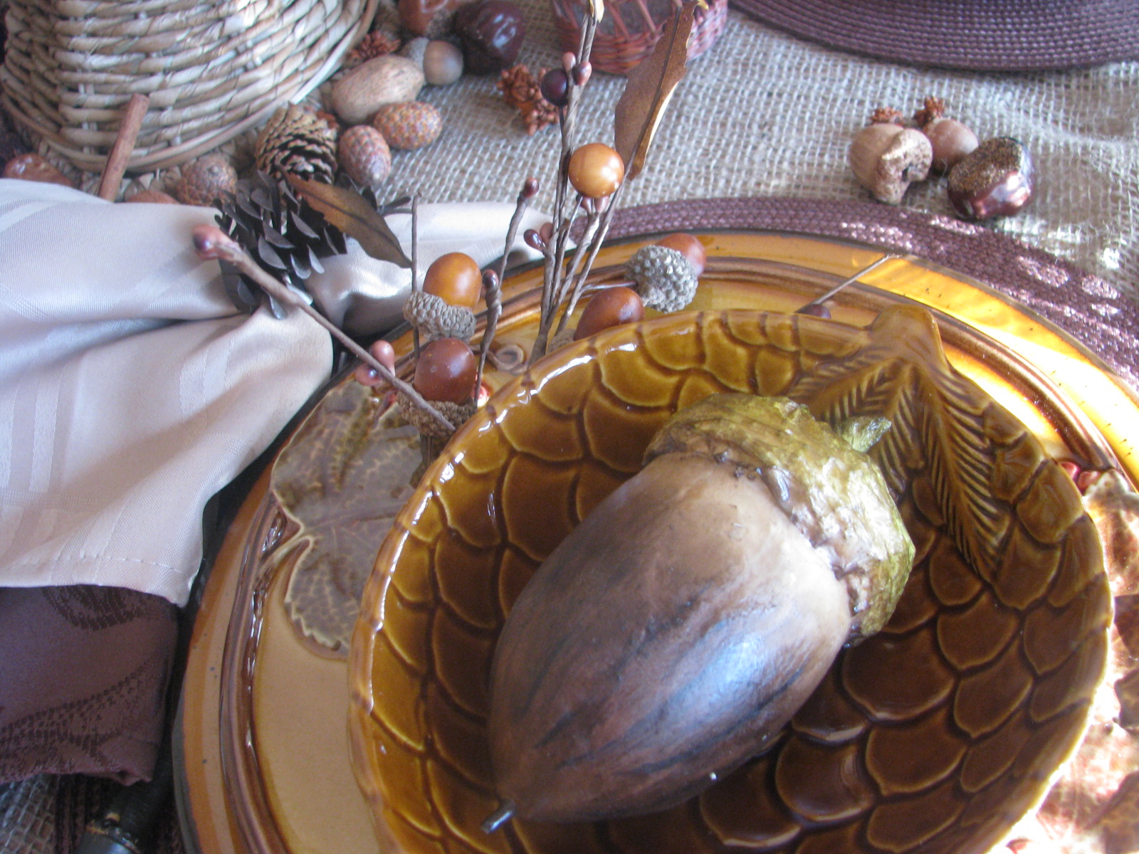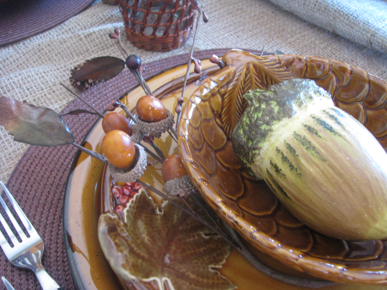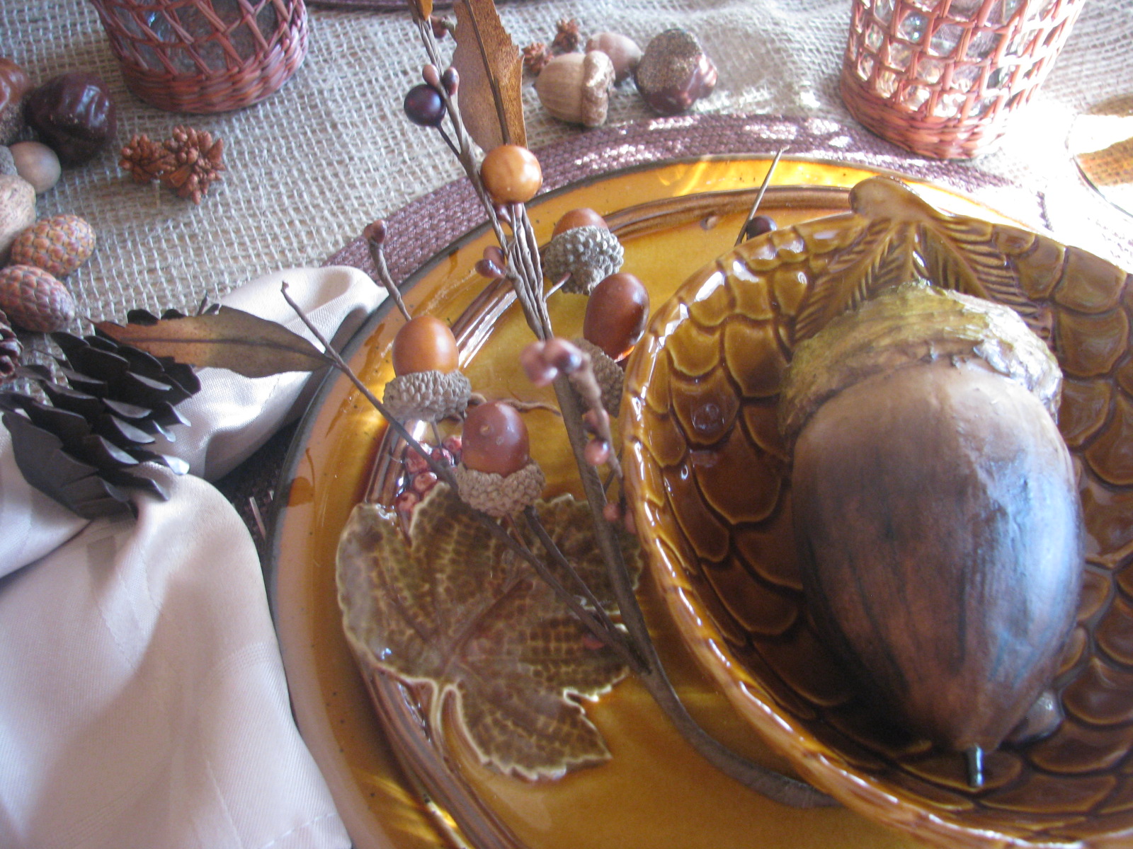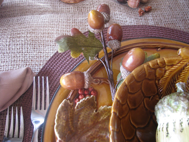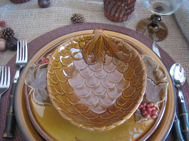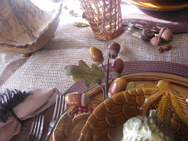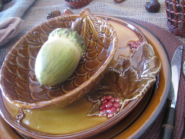 I put a faux acorn at each place in the pinecone bowl. Below that is a beautiful salad dish with raised leaf and berry design. I LOOOOVE these dishes!!