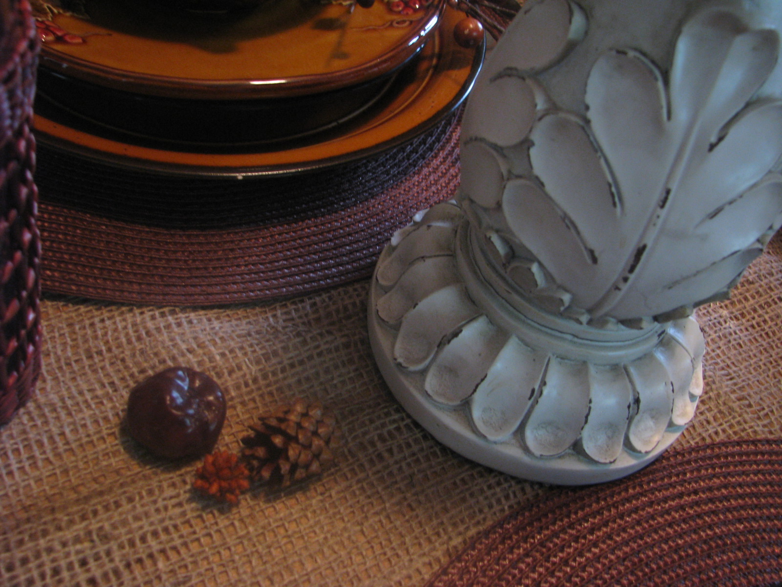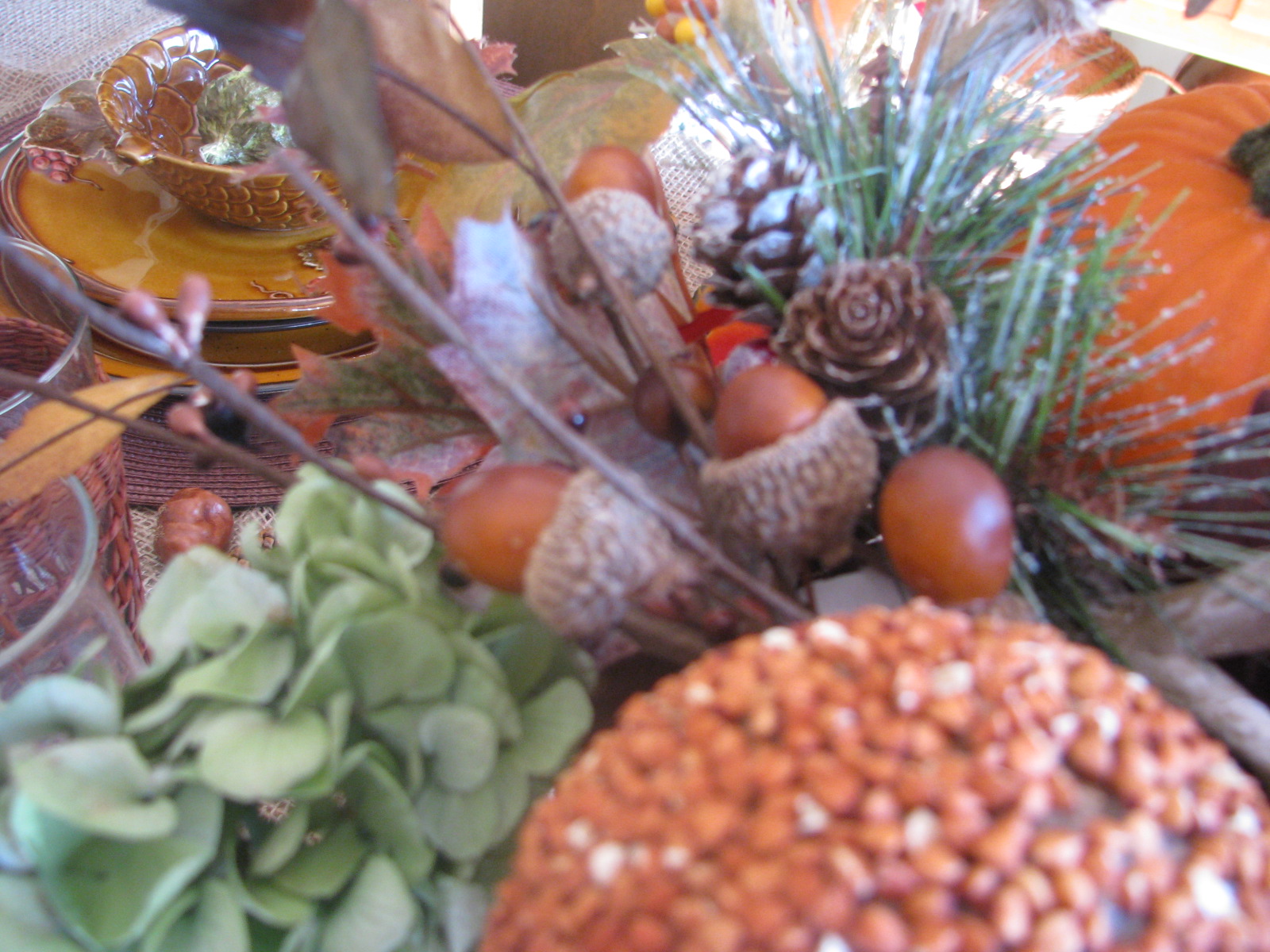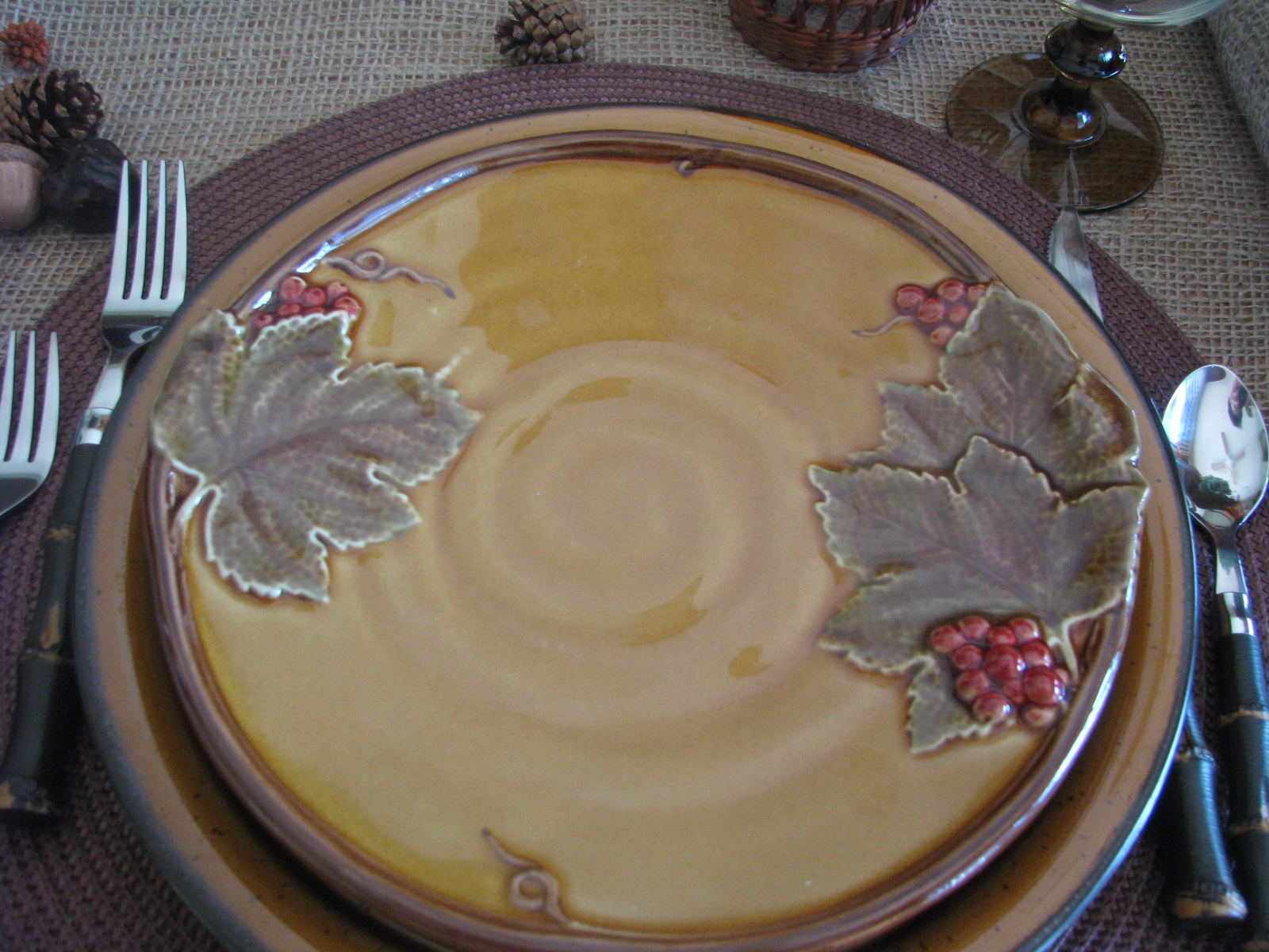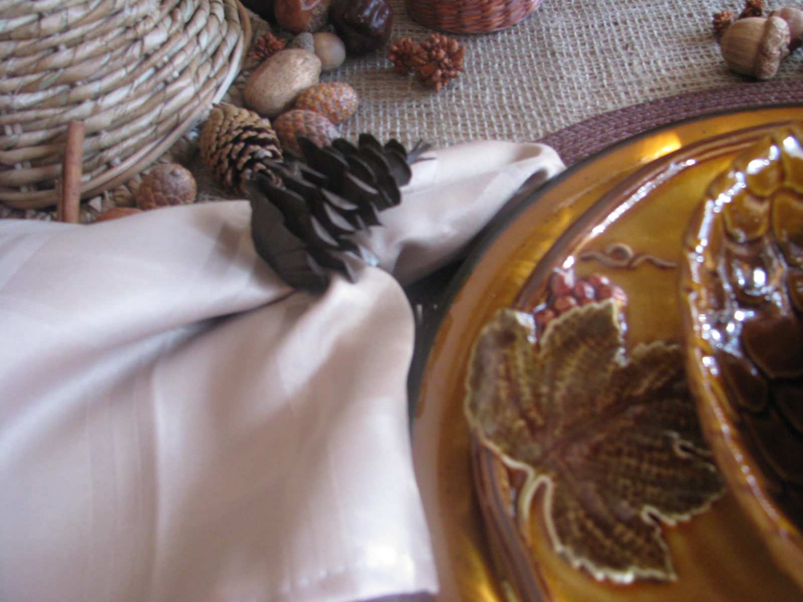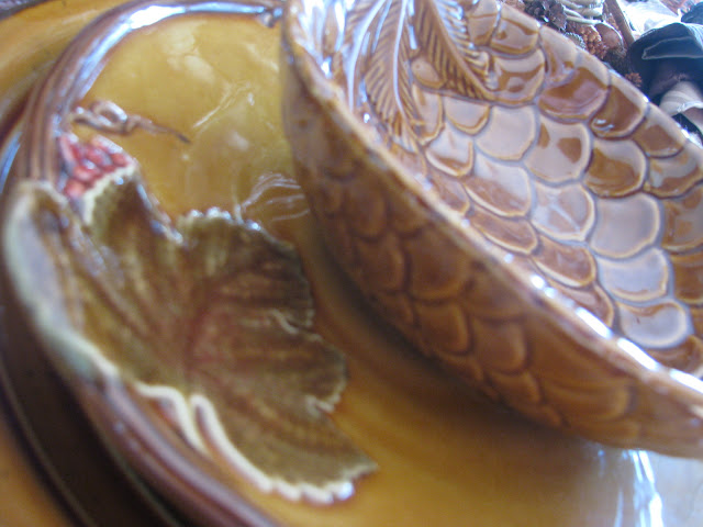 I put a faux acorn at each place in the pinecone bowl. Below that is a beautiful salad dish with raised leaf and berry design. I LOOOOVE these dishes!!