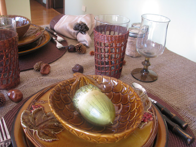 Hi, Pinky! I hope you're doing well and that Thanksgiving isn't sneaking up on you too quickly! The table you have set here is beautiful with all the natural elements. There are so many God-given treasures we can use to embellish our tables, but we don't always notice them. I'm glad you did...the result is a beautiful table with lots of character and charm! I LOVE the dishes, too!!! Have a relaxing weekend...the calm before the storm! :-)