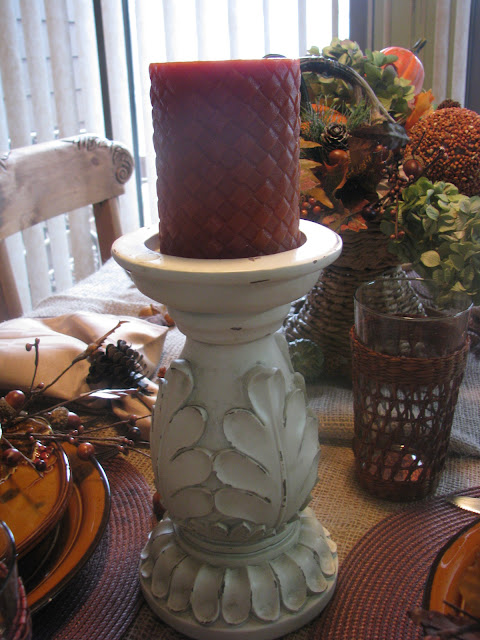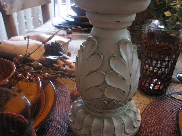 I almost forgot to add my candles! We can't have a table without candles, can we????? These candle holders are adorned with carved leaves. And the pattern on the candle mimics the pattern of the glasses.