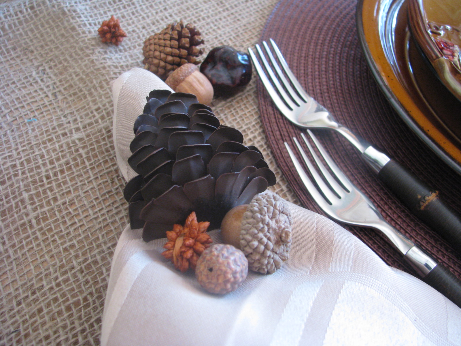 I gathered a chocolate brown napkin with a tan napkin in a pinecone ring.