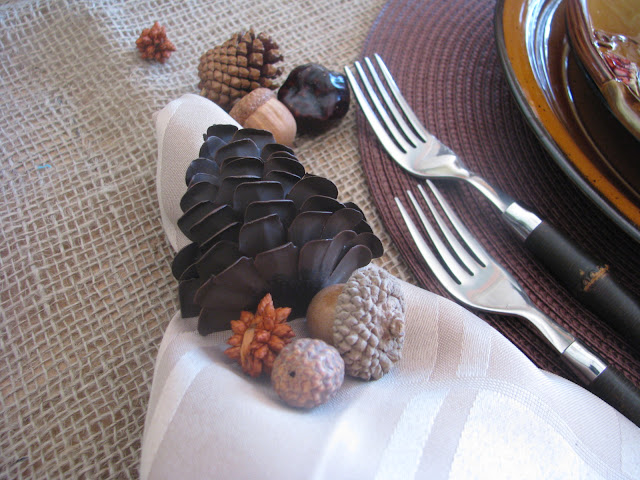 all those fall tones and textures are so pleasing to the eye. I adore the pinecone napkin rings.. Your table is welcoming and beautiful.