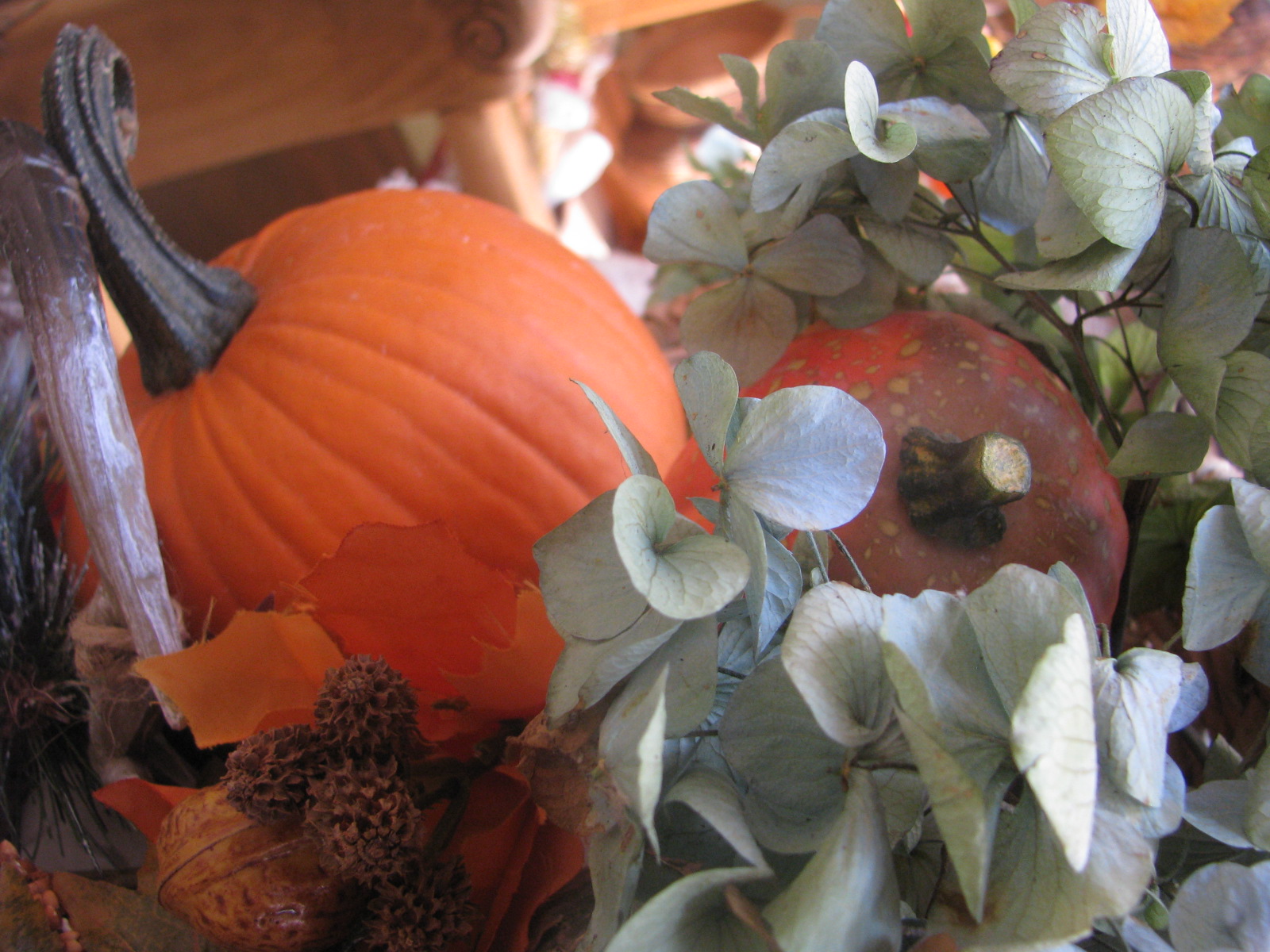 Into the bowl went hydrangeas from the yard, seed balls, vine balls, mini pinecones, acorn picks and leaves!!!! An abundance or natural elements!
