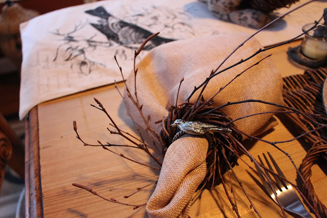 Good morning! I hope Spring has sprung where you are. We are having a roller coaster of temps; 87 on Easter Sunday and by next Sunday it might not get out of the 50's!!! So, I enjoy every single Spring day we have. Joe and I have been working in the yard and soon it will be all mulched and ready for flowers!!! I am antsy to plant but it is a little too soon. As I am putting my bunnies away for another season, I decided to set a new table using birds AND bunnies. The inspiration was this runner that features birds and some script. So, since I have 2 bunnies with script on them they hopped right over to the table! Lots of organics are incorporated onto this table.  Rattan handled placemats, burlap chargers, silver, pearly handled flatware and rattan covered glasses. At first I set the table with just the bird napkin ring then remembered I could use my mini wreaths as rings as you will see further down. The napkins look like burlap too.
